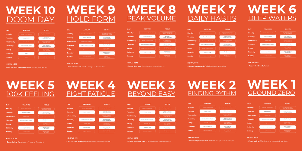 So I recreated my whole 10 week training that I did to run 50 marathons. Seriously, that’s it. And let me warn you: It’s intense - please consult a fitness trainer before trying it!
